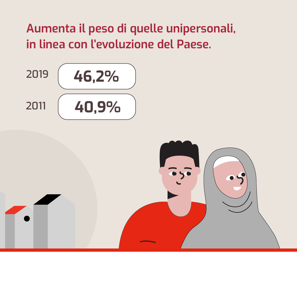 Alla crescita delle famiglie unipersonali, il 35,1% del totale rispetto al 12,9% di cinquant’anni prima, si affianca la diminuzione di quelle più numerose. Dal 2001 al 2011 sono passate da 5.427.621 (24,9% delle famiglie) a 7.667.305 (31,2% del totale). Alla crescita delle famiglie unipersonali si affianca la diminuzione nel corso del tempo di quelle più numerose. Le famiglie unipersonali risultano essere formate da celibi e nubili, ma anche da vedovi e separati.. Nel 1971 le famiglie formate da 5 componenti o più erano 3.437.440 e rappresentavano il 21,5% del totale delle famiglie residenti.